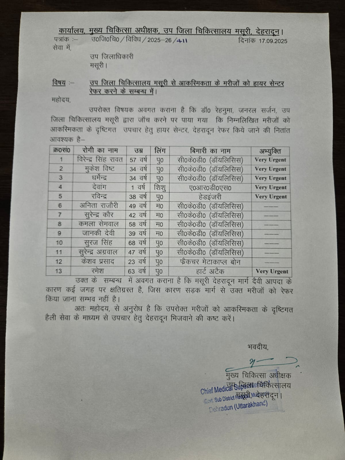 उपचार हेतु लाए गए पेंशट को तत्काल उपचार की आवश्यता थी जिनमें डायलिसिस के पेंशट का डायलिसिस का समय हो गया था तथा अन्य पेंशटों को तत्काल समयावधि में उपचार की आवश्यकता थी जिस पर जिलाधिकारी ने पेंशेंट को एयरलिफ्ट करने के निर्देश दिए किन्तु मौसम खराब होने के कारण एयरलिफ्ट नही किया जा सका जिस पर जिलाधिकारी ने उप जिलाधिकारी मसूरी राहुल कुमार, तथा उप जिलाधिकारी कुमकुम जोशी को जिम्मा सौंपते हुए तत्काल ट्रांसशिपमेंट करने के निर्देश दिए।